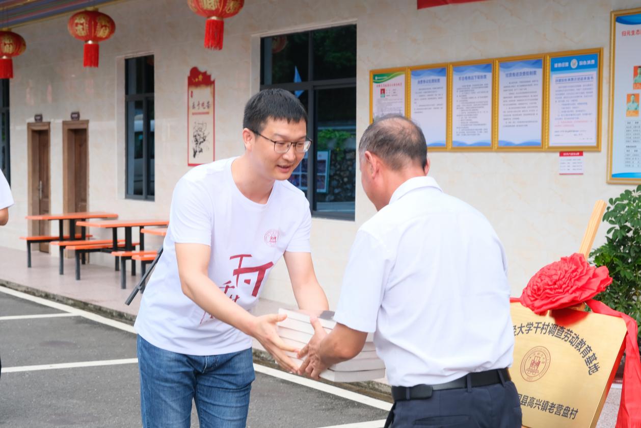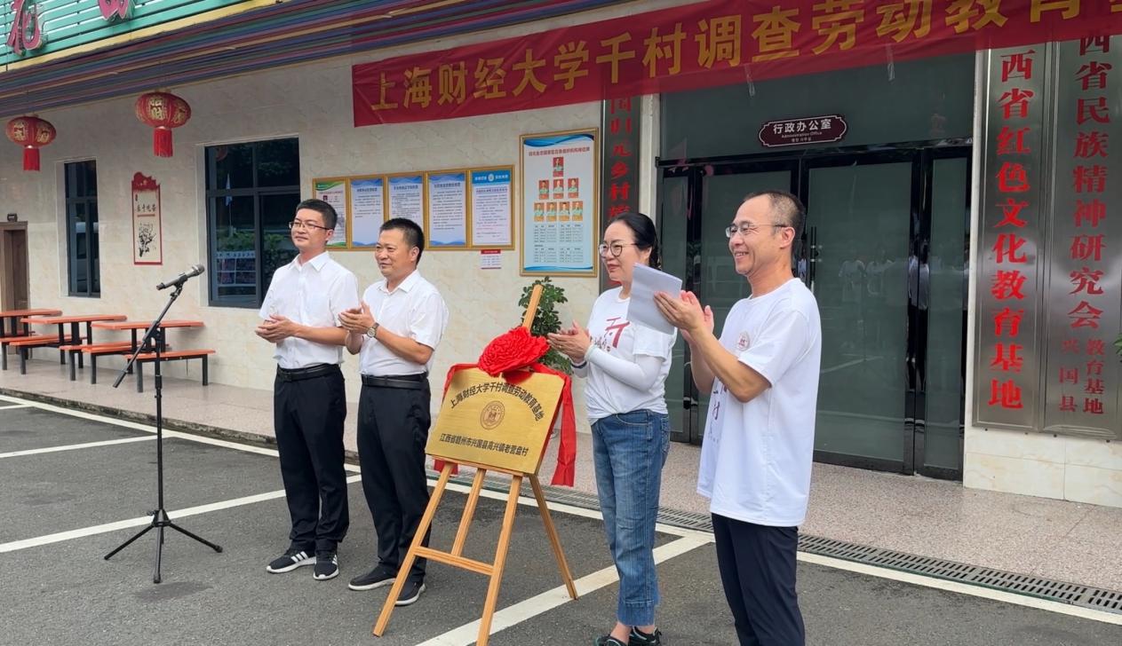 7月18日8时,刘兰娟教授一行前往兴国县高兴镇老营盘村,举办了千村调查劳动教育基地揭牌仪式,共同见证兴国革命老区和上海财经大学精诚合作的重要时刻,揭牌仪式由兴国县高兴镇党委书记廖桥生主持。县人大常委会副主任曾春生致辞,强调了上海财经大学千村调查劳动教育基地落户兴国县,是充分发挥兴国县红色资源优势,推进县校地合作、互利共赢的良好开端。刘兰娟、赵鹏飞和兴国县曾春生、廖桥生共同揭牌千村调查劳动教育基地——兴国县高兴镇老营盘村。数字经济系副主任(主持工作)肖升生老师向兴国县政府赠送千村调查系列图书。最后,数字经济系党总支书记赵鹏飞老师讲话,他介绍了学校千村调查发展历程和育人特色,并希望发挥千村调查劳动教育基地纽带和桥梁作用,推进学校与兴国县长期共建。